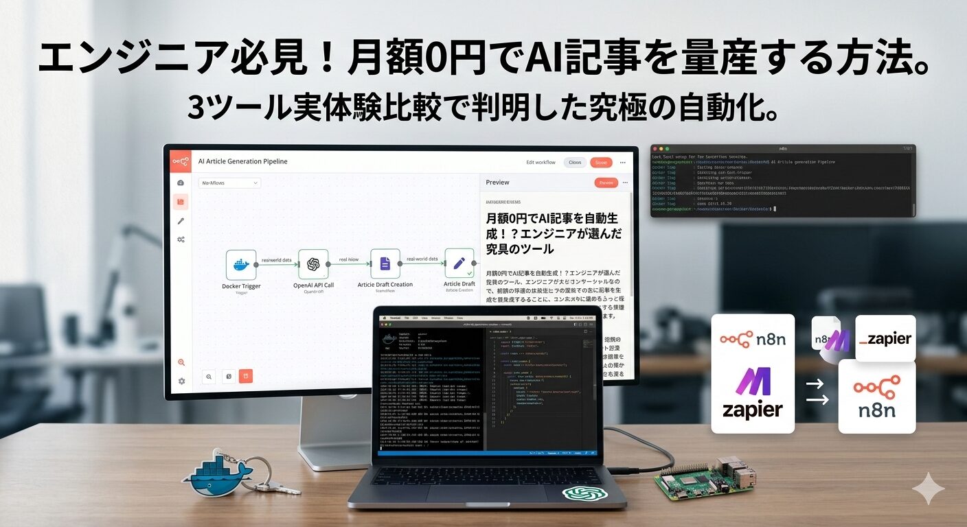 n8nをDockerでセルフホストすれば月額費用は実質0円です。今後Oracle Cloud Free Tierに移行すれば、サーバー代もかかりません。OpenAI APIの利用料も月30記事の生成で約$0.10(約15円)なので、ほぼ無視できるレベルです。
