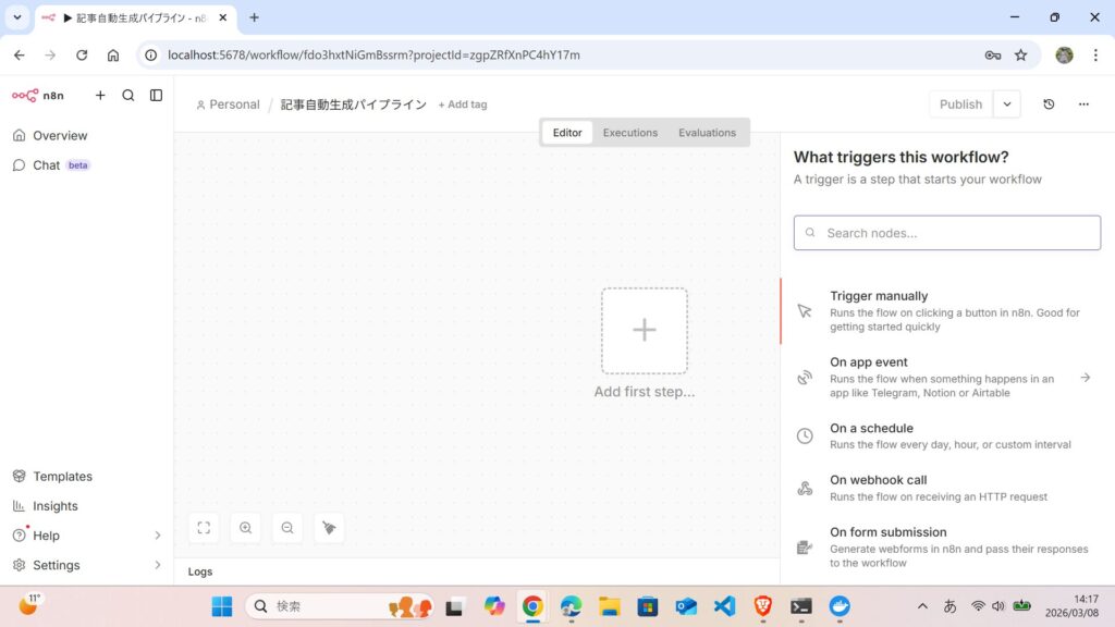 実際にアカウントを作成してみましたが、ログイン直後からドラッグ&ドロップでフローが組めるので迷うことがありません。API設定なども不要でn8nと比べて圧倒的にラク。