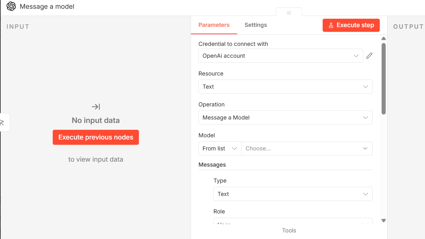 選択すると、OpenAIの細かい設定をできる画面に移ります。基本的に設定済みのため、Modelだけ選択すれば動きます。