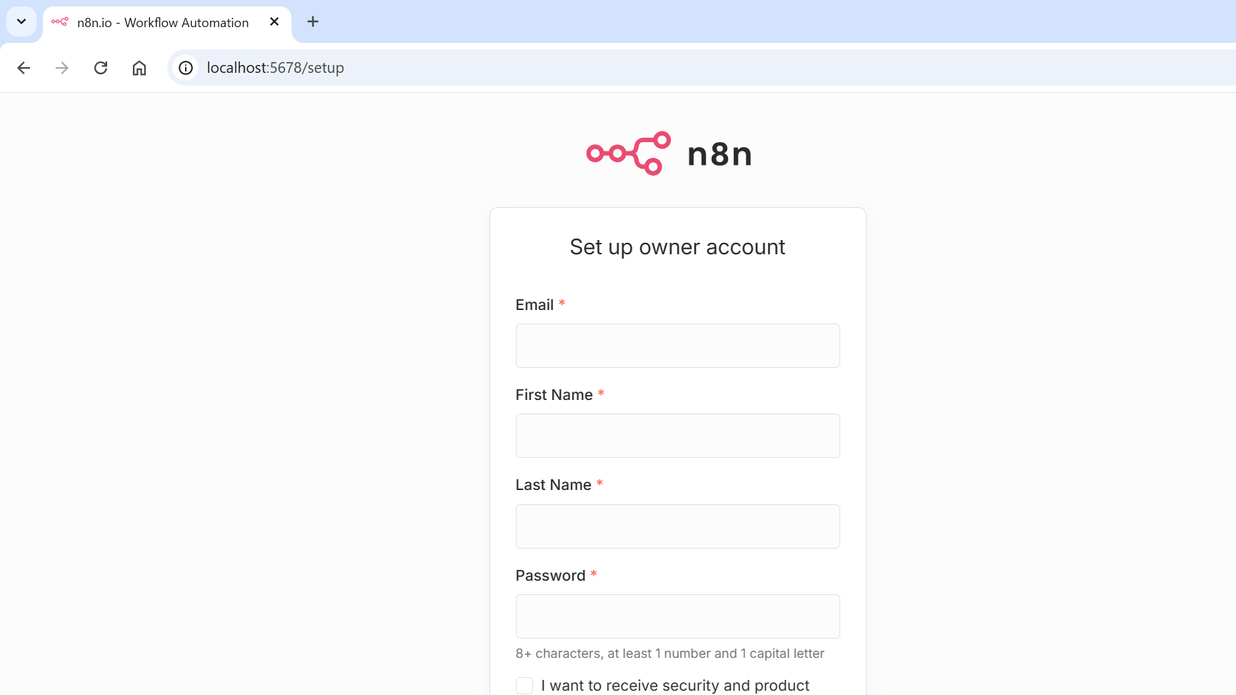 するとn8nのアカウント設定画面が起動しているはずです。