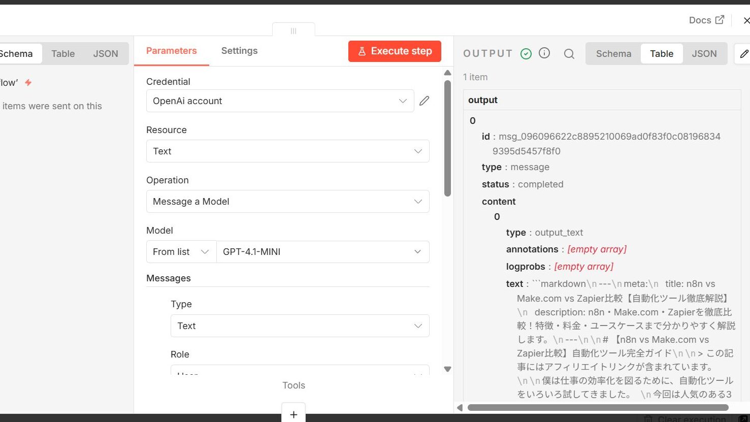 最初のセットアップに苦労しますが、一度動いてしまえばOpenAI APIのノードを追加してワークフローを組むまで10分もかかりませんでした。