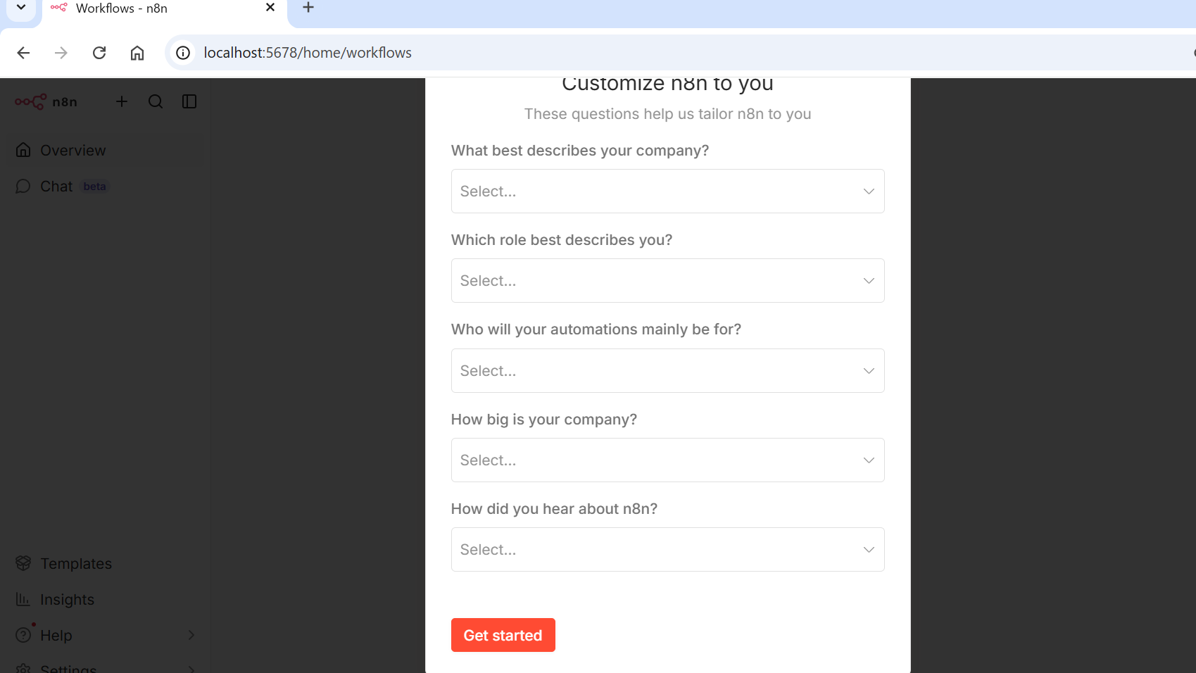 必要情報を入力するとn8nのワークフロー画面の前にアンケートが出てきます。何も入力せず[Get started]で大丈夫です。